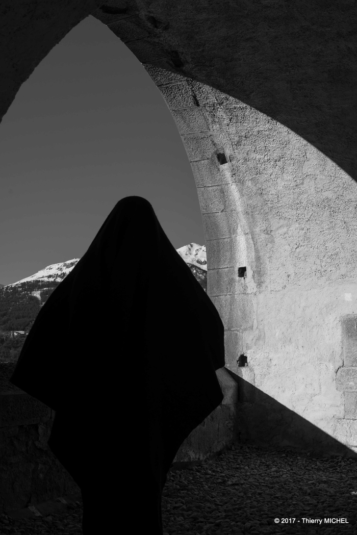 « L’architecture du Fort des Salettes de Briançon, dédié à la défense, le propulse aux frontières du clair obscur, du dedans et du dehors, de la fermeture et de l’ouverture. En y pénétrant, j’ai été attiré par ses immenses salles parquetées aux murs blanchis de chaux et par la circularité des coursives baignées d’ombres et de lumières par les baies qui donnent sur le paysage montagneux. Offrant ce double regard possible vers l’extérieur comme vers l’intérieur du fort grâce aux galeries à feux de revers, ce lieu a pris progressivement une dimension très intime dans mon esprit. Il devenait mon fort intérieur. Un endroit pétrit de contrastes, ni dans le noir complet, ni dans la lumière totale, se révélant dans cette complémentarité à l’image de ma complexité d’humain. Un espace où se concentrait tous les possibles : l’enfermement et l’ouverture, l’immobilisme et le mouvement. C’est le lieu que j’ai choisi pour photographier la migration d’un personnage d’un état à un autre, son ascension depuis un lieu clos et profond vers un espace plus en hauteur et ouvert à lumière du jour. Une vision de la frontière inspirée par l’énergie de la conquête, celle d’une nouvelle posture. »
